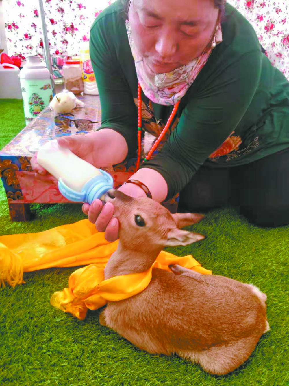 妻子扎西卓瑪始終沒有放棄喂養(yǎng)它,最初的3天,她每天都要花6個多小時,或跪著或趴著,把奶嘴一次次伸進“豆豆”口中,但又一次次被吐了出來。一家人整夜操心,輪流給它喂水喂奶,扎西卓瑪還在它的脖子上系了一條黃色的哈達,當做“幸運結”,希望小原羚能活下來。