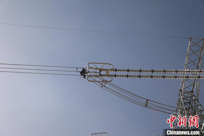 圖為國(guó)網(wǎng)青海超高壓公司輸電專(zhuān)業(yè)人員正在開(kāi)展750千伏青塔I線14號(hào)鐵塔消缺工作。 董慶芳 攝