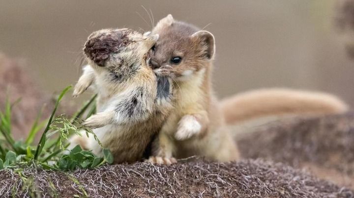 2021年7月22日在祁連山國(guó)家公園青海片區(qū)拍攝的一只香鼬(右)叼著一只捕獲的鼠兔。鮑永清 攝 新華社發(fā)