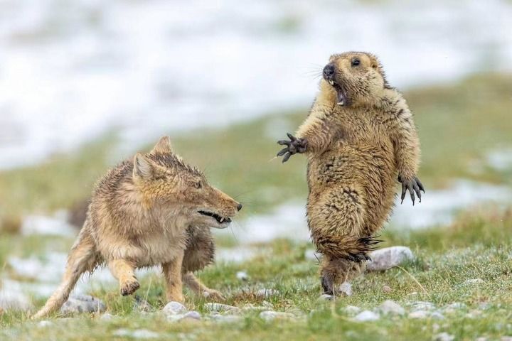 這是2018年6月7日鮑永清在祁連山國(guó)家公園青海片區(qū)拍攝的作品《生死對(duì)決》(左為藏狐,右為旱獺)。鮑永清 攝 新華社發(fā)