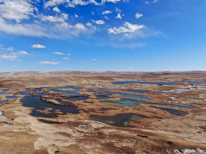在青海省果洛藏族自治州瑪多縣境內拍攝的一處濕地(無人機照片)。新華社記者 張龍 攝