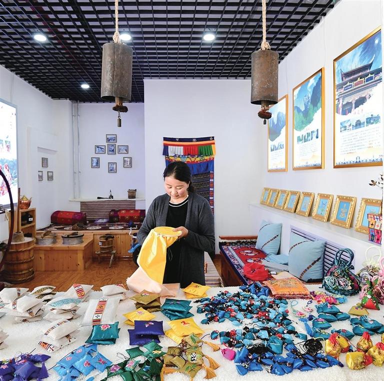 德琴巧手民俗文化旅游發(fā)展貿(mào)易有限公司負責(zé)人寧菊英正在繡香包。 新甘肅·甘肅日報記者 韋德占