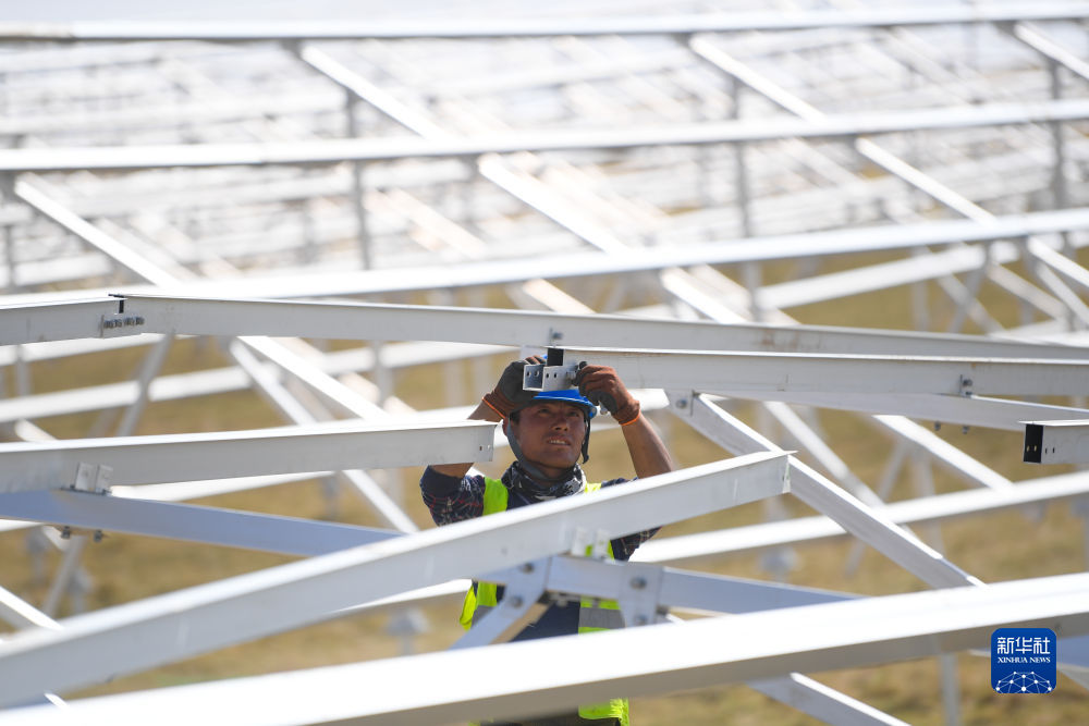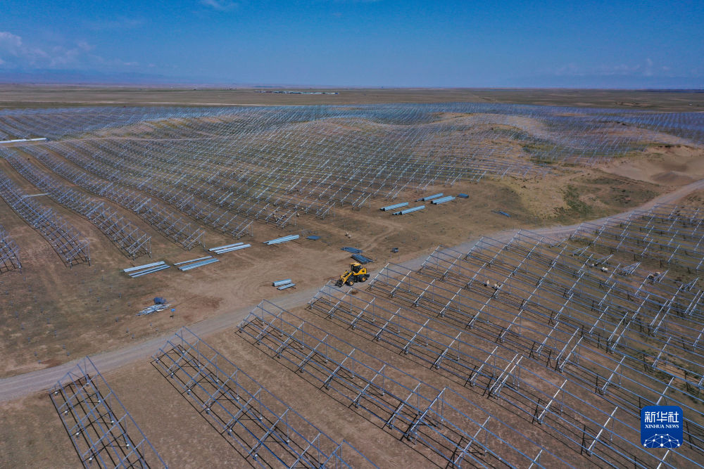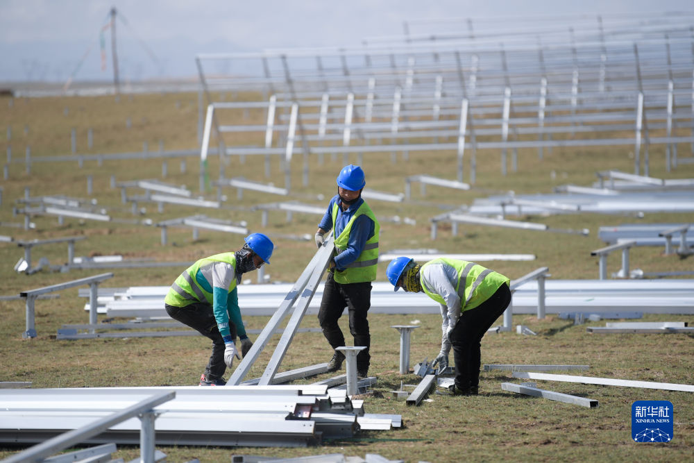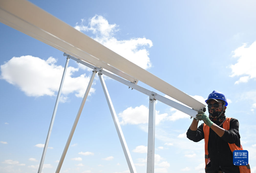 6月8日,工人在國家能源集團海南基地共和縣100萬千瓦牧光儲二期20萬千瓦建設項目施工。新華社記者 張龍 攝