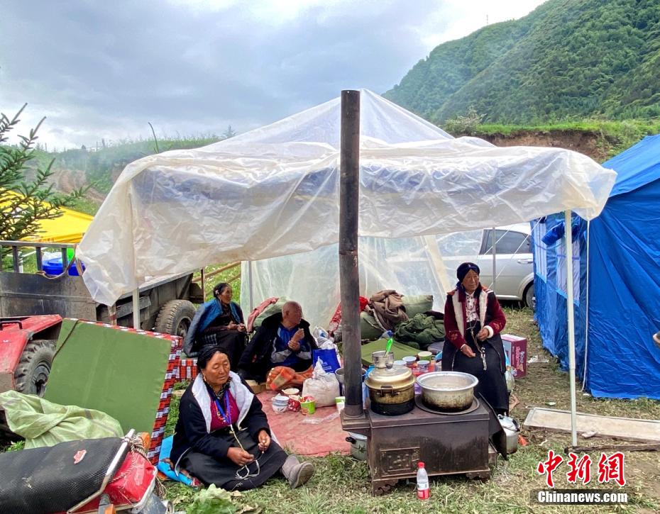 馬爾康市草登鄉(xiāng)呷秋受災(zāi)村民坐在自己的帳篷前小憩。四川森林消防 供圖