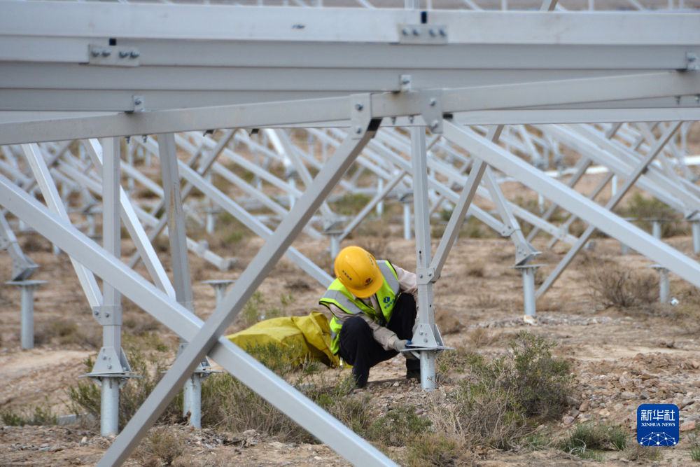 6月7日,在國家電投集團(tuán)黃河公司德令哈220萬千瓦多能互補項目一期100萬千瓦光伏項目建設(shè)現(xiàn)場,工人在安裝光伏支架。新華社記者 王浡 攝