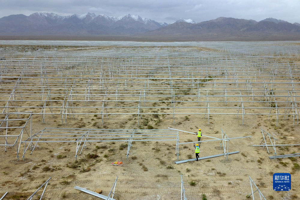 6月7日,在國家電投集團(tuán)黃河公司德令哈220萬千瓦多能互補項目一期100萬千瓦光伏項目建設(shè)現(xiàn)場,工人安裝光伏支架。新華社記者 范培珅 攝