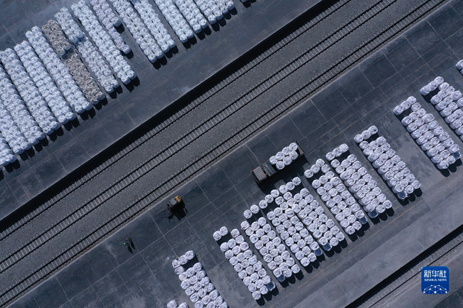 在青海鹽湖工業(yè)股份有限公司鉀肥分公司貨場,車輛在裝運(yùn)鉀肥(無人機(jī)照片)。(資料圖)新華社記者 張龍 攝