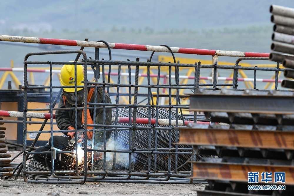 一名工人在施工現(xiàn)場焊接鋼筋。