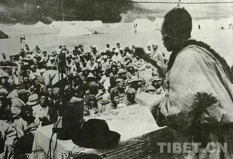 圖為1952年8月果洛工作團在達日縣查郎寺召開果洛頭人、代表聯(lián)誼會議,扎喜旺徐團長在聯(lián)誼會議上作有關民族團結(jié)的報告 圖片由央金提供
