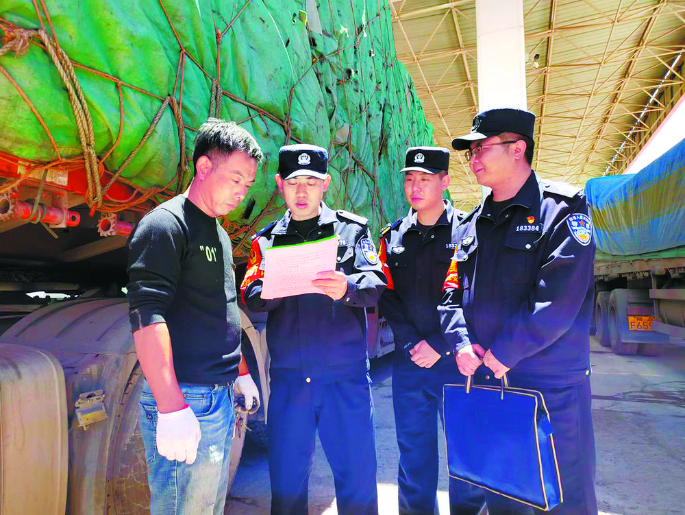 沱沱河站派出所所長(zhǎng)沈衛(wèi)平(左二)和民警們一起向客車司機(jī)宣傳愛路護(hù)路知識(shí)。青藏鐵路公安局格爾木公安處供圖