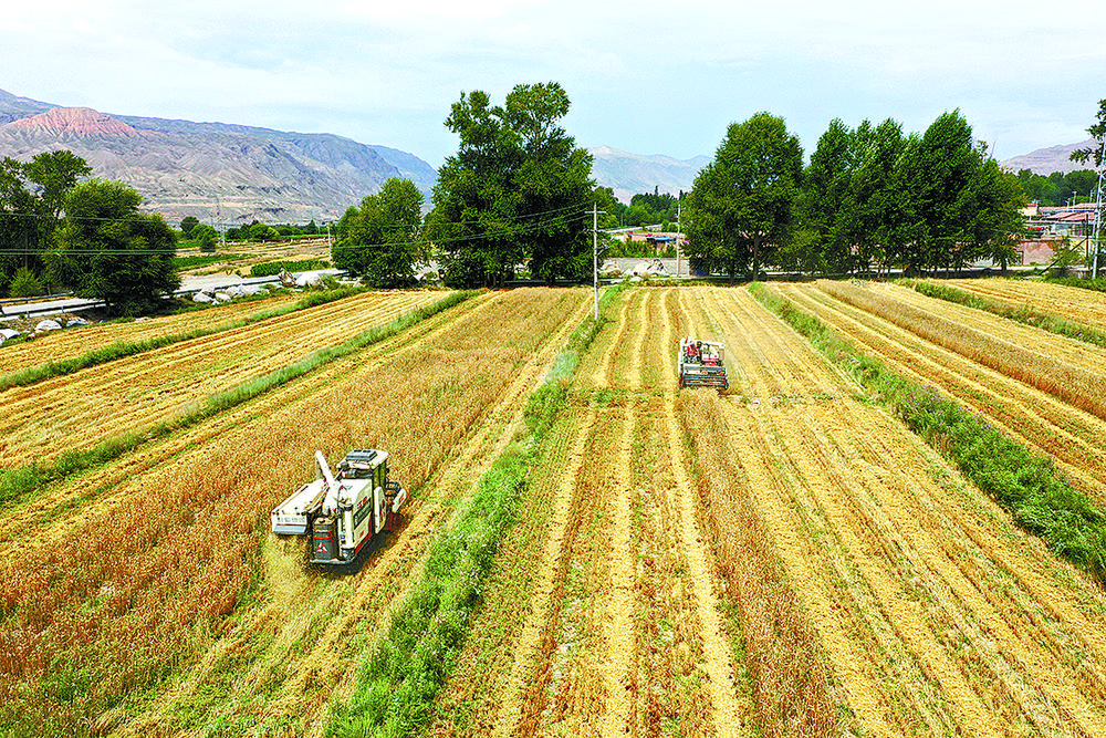 “這里是我們的小麥制種基地,目前我們的主推品種是京437和中麥175,京437品種畝產(一畝約等于0.067公頃)可達400千克左右。今年的冬小麥長勢良好,顆粒飽滿,用兩天時間將會把20公頃全部收完!”貴德縣金穗農業(yè)開發(fā)有限公司副經理余富強捧起剛收割的新麥,仔細查看,滿臉洋溢著豐收的喜悅。