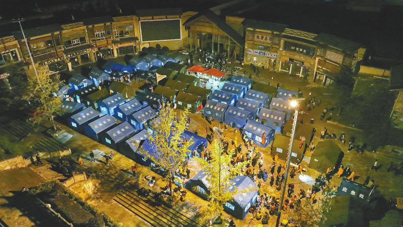 9月5日晚,瀘定縣磨西鎮(zhèn)貢嘎廣場的臨時安置點燈火通明。 四川日報全媒體記者 吳聃 攝