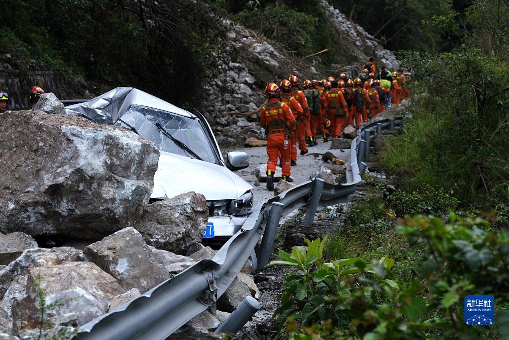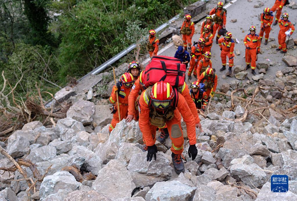 9月6日,在瀘定縣磨西鎮(zhèn)共和村,救援人員徒步進入災(zāi)區(qū)救援。新華社 程雪力 攝