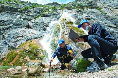 科考隊員范越(右)與董士琦在瀾滄江源區(qū)的溶洞出水口進行水質(zhì)檢測。