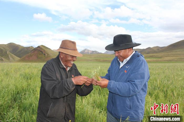 資料圖為玉樹市上拉秀鄉(xiāng)干部查看燕麥試種情況。玉樹市委宣傳部供圖
