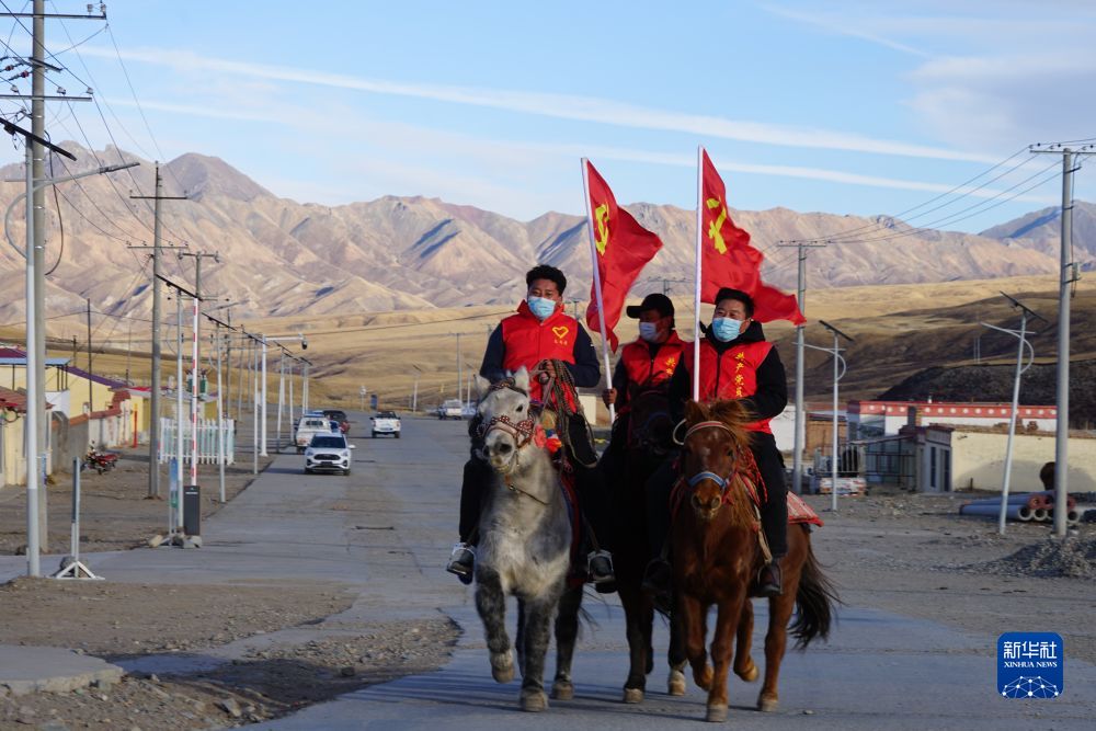 冬日,地處祁連山腳下的達(dá)玉村陽(yáng)光遍灑。雖然天氣晴好,但寒風(fēng)的凜冽絲毫不減。才讓扎西一手握著黨旗,一手拽緊韁繩,熟練地蹬上馬鐙、躍身上馬。