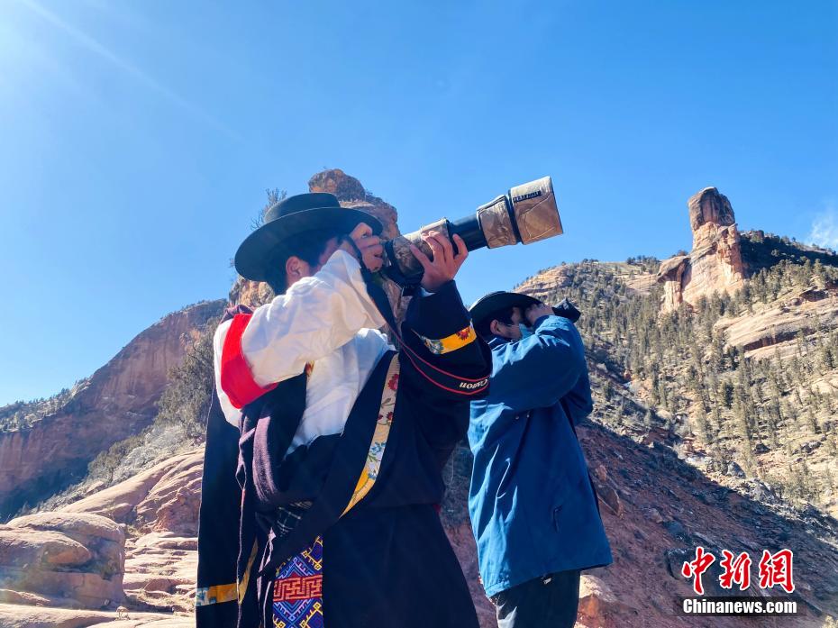 圖為達(dá)杰朋措(左)和生態(tài)管護(hù)員在瀾滄江源園區(qū)拍攝野生動(dòng)物。仁青達(dá)杰 攝