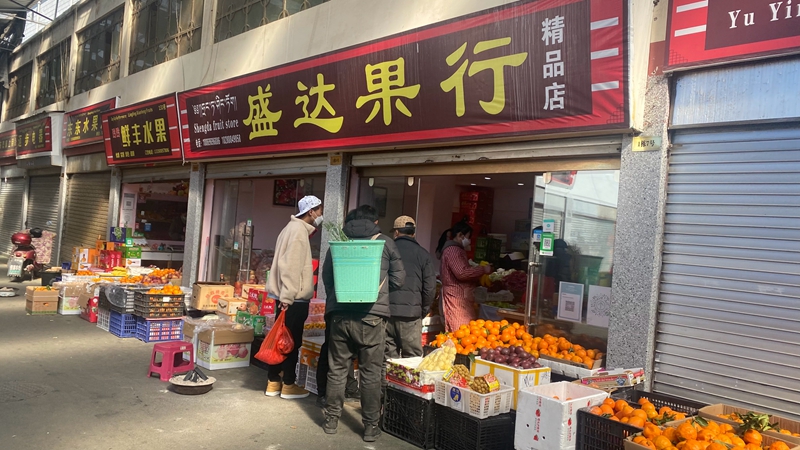 市場內,記者看到開張的攤位上擺著新鮮的蔬菜、水果、還有鮮肉等,其中生意最好的要數生鮮店。