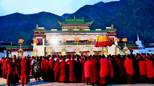 拉卜楞寺大經(jīng)堂門樓前陳列出九尊工藝精湛、用酥油塑成的佛像,眾僧列隊(duì)、朗誦經(jīng)文,僧俗群眾共同祈祝新的一年吉祥安康,慕名前來(lái)的國(guó)內(nèi)外游客,紛紛拍照留影,寺院熱鬧非凡,場(chǎng)面蔚為壯觀。