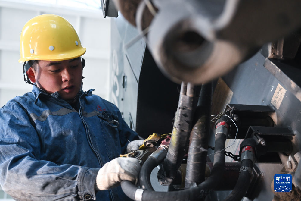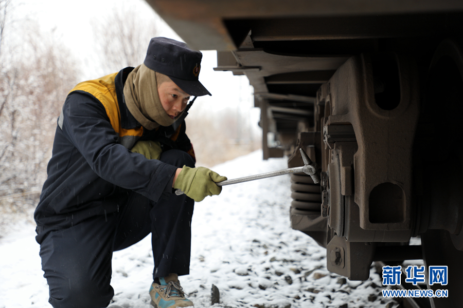 列檢人員對(duì)貨運(yùn)列車進(jìn)行檢查。新華網(wǎng) 馬建林 攝