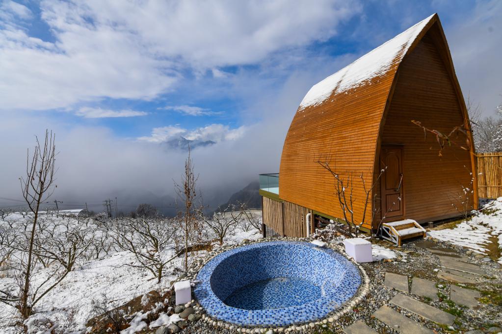 克枯村位于長(zhǎng)江上游支流岷江邊的山腰上,是羌族聚居村寨。記者日前沿盤山公路進(jìn)入村中看到,李子樹枝干上掛滿雪花,山林里6棟復(fù)式獨(dú)棟木屋民宿與遠(yuǎn)處的雪山峽谷遙相呼應(yīng),旁邊是視野開闊的網(wǎng)紅餐廳,沿著旅游步道前行便看到幽蘭深邃的冰瀑群。