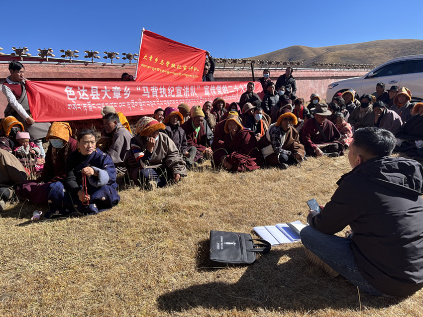“針對(duì)色達(dá)高寒偏遠(yuǎn)、地廣人稀,牧區(qū)群眾生活居住較分散的情況,我們調(diào)配縣鄉(xiāng)村三級(jí)紀(jì)檢監(jiān)察力量,逐步組建起精通藏漢雙語(yǔ)、熟悉紀(jì)法知識(shí)、擅長(zhǎng)群眾工作的馬背執(zhí)紀(jì)宣講隊(duì),把黨的聲音傳遞到云端藏寨、天邊牧場(chǎng)?!鄙_(dá)縣紀(jì)委書記、監(jiān)委主任陳玉龍介紹,黨的二十大以來,宣講隊(duì)已開展宣講活動(dòng)20余場(chǎng)次,推動(dòng)為群眾辦實(shí)事10余件,解決困難訴求20件。