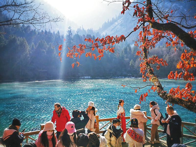 2月14日,來(lái)自遼寧的游客郭婷和男友在九寨溝風(fēng)景名勝區(qū)的五花海棧橋上拍了一組照片發(fā)在朋友圈,并配上文字:“兔年第一站,打卡九寨溝。”