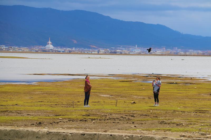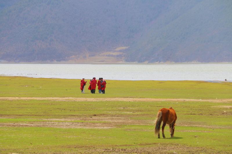 春分節(jié)氣前后,香格里拉氣溫回暖,納帕海的草原也逐漸染綠,游客們在欣賞草原春景的同時也不忘合影留念。