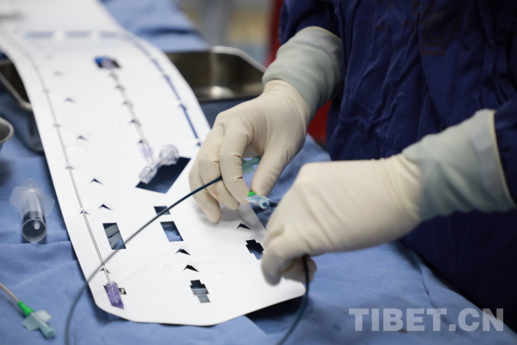 圖為北醫(yī)三院專家團(tuán)隊(duì)在為來自青海省果洛藏族自治州的先心病患兒手術(shù)時使用的直徑僅4毫米的介入導(dǎo)管 攝影:劉莉