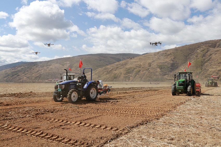 隨著一聲擲地有聲的“開耕……”,十余輛大型農(nóng)機(jī)具緩緩入地,現(xiàn)場為大家展示了青稞全程機(jī)械化作業(yè)。20臺免耕播種機(jī)、約翰迪爾1354輪式拖拉機(jī)等機(jī)具在農(nóng)機(jī)手熟練操控下,旋耕、播種、覆土、鎮(zhèn)壓一次完成,無人機(jī)飛舞在天空,噴灑著農(nóng)藥,一幅現(xiàn)代版鐵?!按焊备偧紙D躍入眼簾,在場人員紛紛掏出手機(jī)、相機(jī)拍攝記錄下這富有“科技感”的畫面。