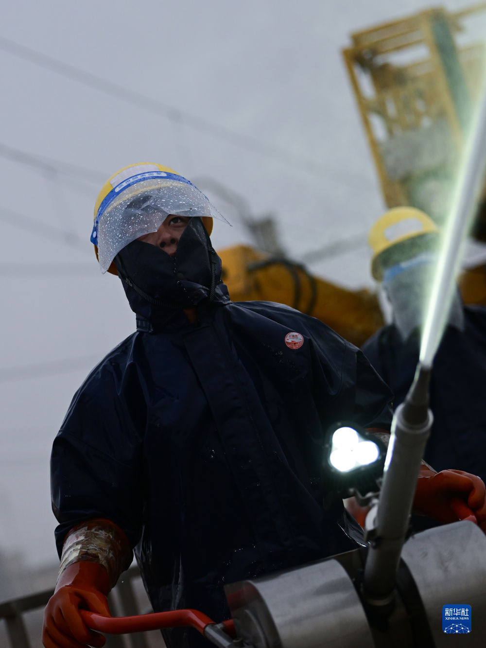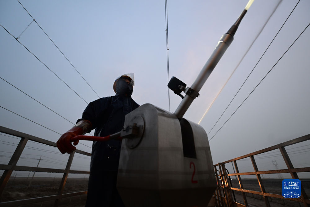 4月20日,中國鐵路青藏集團有限公司西寧供電段格爾木大修車間大修網(wǎng)工區(qū)檢修工王家彤使用高壓沖洗水槍對絕緣子設(shè)備進行清洗。新華社記者 張龍 攝