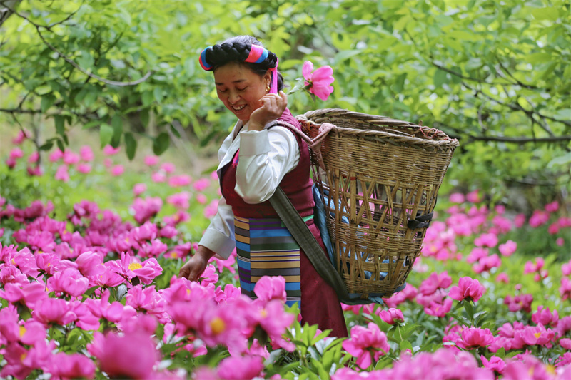 五月,正是芍藥花開的最佳時節(jié)。在維西縣塔城鎮(zhèn)其宗村村民楊小花家的芍藥地中,大片的芍藥花競相開放,花團錦簇、花香四溢,楊小花正在田間忙碌著采摘芍藥花朵,芍藥花及根采挖后都可出售,在增加收入的同時也成為田間地頭一道美麗的風景線。