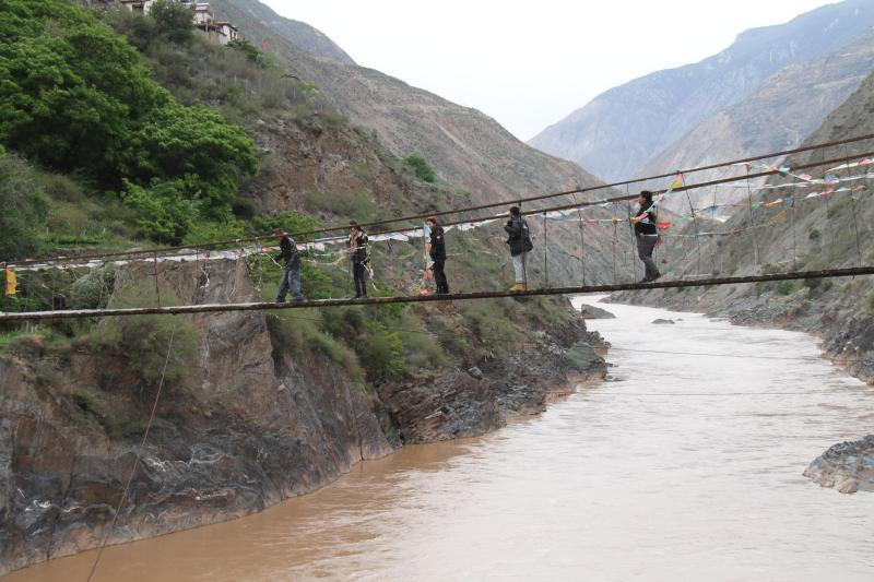 普渡橋的六根鐵索和旁邊竹篾編成的溜索橫跨在德欽縣佛山鄉(xiāng)溜筒江村口的瀾滄江上,在凜冽的江風(fēng)中發(fā)出“嗚嗚”的響聲,仿佛在訴說百年的滄桑歷史。