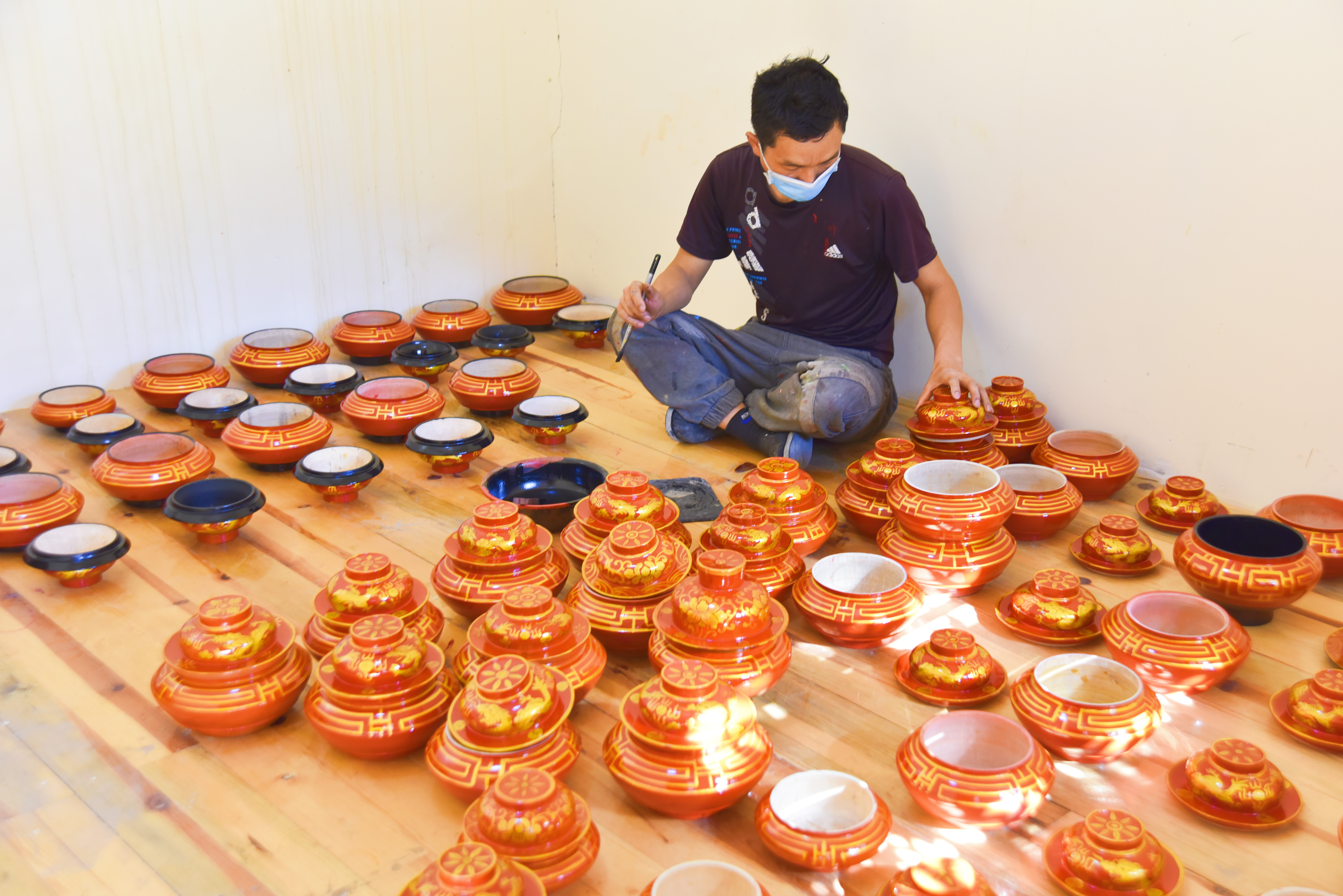 走進德欽縣奔子欄鎮(zhèn)益西藏文化產(chǎn)業(yè)有限公司,手工藝人們正有條不紊地加工著藏式木碗。作坊里,有的正在精心進行手工打磨,有的一手托碗一手用畫筆為上好底漆的木碗描上極具藏族特色的紋飾。