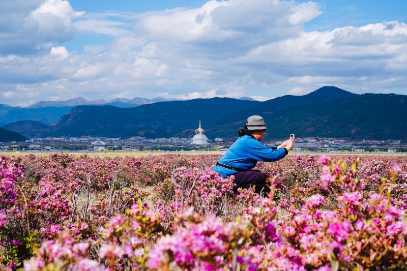 五月的香格里拉,是杜鵑花盛開(kāi)的季節(jié)。建塘鎮(zhèn)稱(chēng)尼壩子上的粉色杜鵑開(kāi)放,大片的杜鵑鋪滿(mǎn)了山腳下的壩子,仿佛給大地鋪上了粉色地毯。