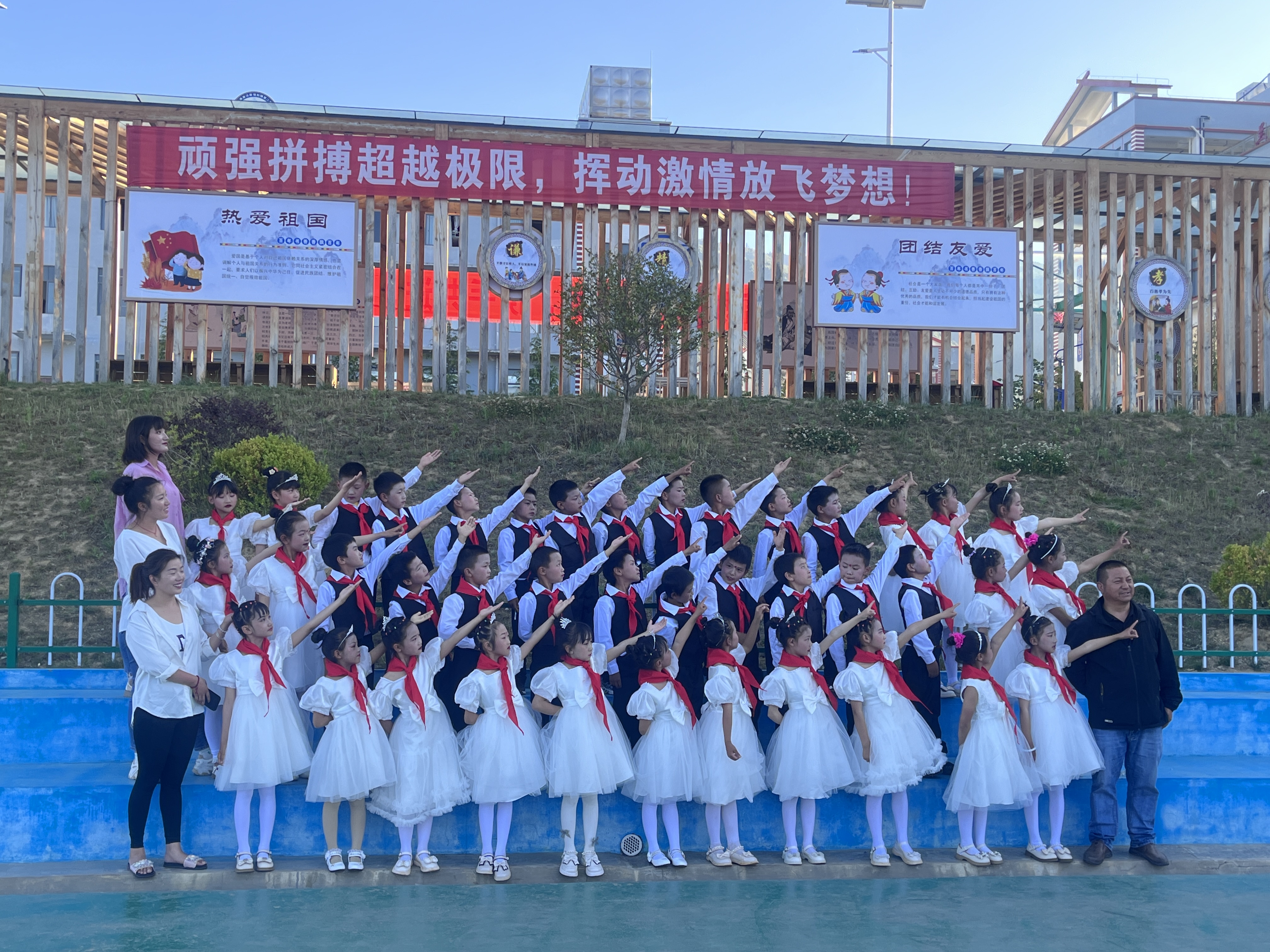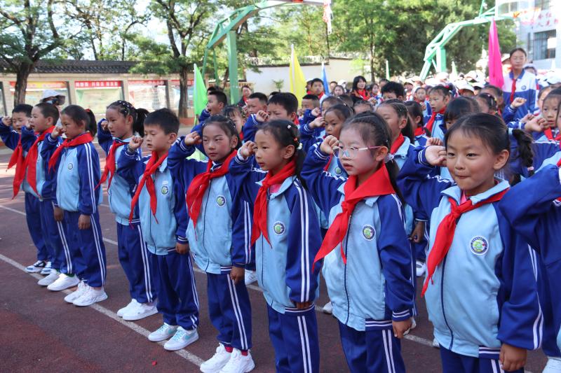 上午8點(diǎn)30分,活動(dòng)正式開始,升國旗、唱國歌、行隊(duì)禮,孩子們激動(dòng)的心情溢于言表。在新隊(duì)員入隊(duì)儀式上,共有138名學(xué)生加入光榮的中國少年先鋒隊(duì)組織,老隊(duì)員們?yōu)樗麄兣宕骷t領(lǐng)巾,鮮艷的紅領(lǐng)巾在新隊(duì)員的胸前飄揚(yáng),也在燦爛的朝陽下熠熠閃光。隨后,該校對獲得“2022—2023年度“優(yōu)秀少先隊(duì)員”“優(yōu)秀班干部”“紅領(lǐng)巾一星獎(jiǎng)?wù)聵s譽(yù)”的同學(xué)進(jìn)行了表彰。最后,學(xué)校舞蹈社團(tuán)的孩子們?yōu)榇蠹規(guī)砭实母栉璞硌?,把整個(gè)活動(dòng)推向高潮。 (張燕 攝影報(bào)道)