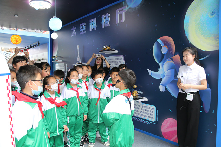 “航天夢是中國夢、華夏夢,神舟十六號載人飛船發(fā)射成功并進(jìn)入預(yù)定軌道。古人仰望星空,幻想上天攬月的夢想,在一代代中國航天人的努力下逐漸變?yōu)榱爽F(xiàn)實?!薄凹t領(lǐng)巾”講解員劉嘉沐在解說他負(fù)責(zé)的天空科技廳時,將這一喜訊分享給了在場的同學(xué)們?!跋M芙枭裰凼栞d人飛船發(fā)射成功的機(jī)會,在科普周活動中普及航天知識,讓更多的學(xué)生深入了解航天文化,引導(dǎo)青少年傳承航天精神、點燃航天夢想?!敝菘茀f(xié)負(fù)責(zé)人告訴記者。