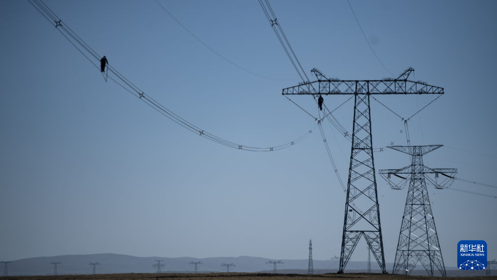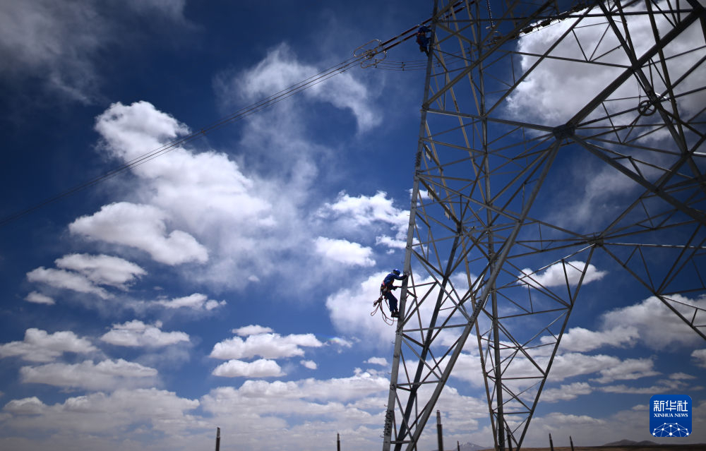 在青海省海西蒙古族藏族自治州格爾木市唐古拉山鎮(zhèn)境內(nèi),檢修人員在走線巡檢中(6月3日攝)。新華社記者 張宏祥 攝