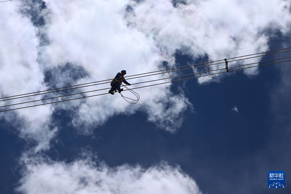 在青海省海西蒙古族藏族自治州格爾木市唐古拉山鎮(zhèn)境內(nèi),檢修人員在走線巡檢中(6月3日攝)。新華社 潘彬彬 攝