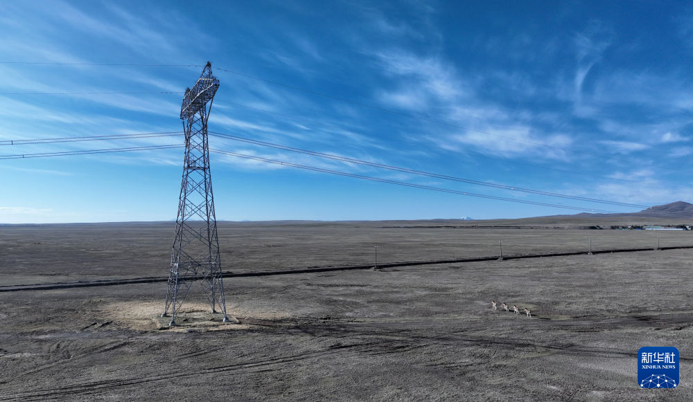 6月4日,在青海省海西蒙古族藏族自治州格爾木市唐古拉山鎮(zhèn)境內(nèi),幾只藏野驢從青藏聯(lián)網(wǎng)工程輸電鐵塔前經(jīng)過(無人機(jī)照片)。新華社記者 張宏祥 攝