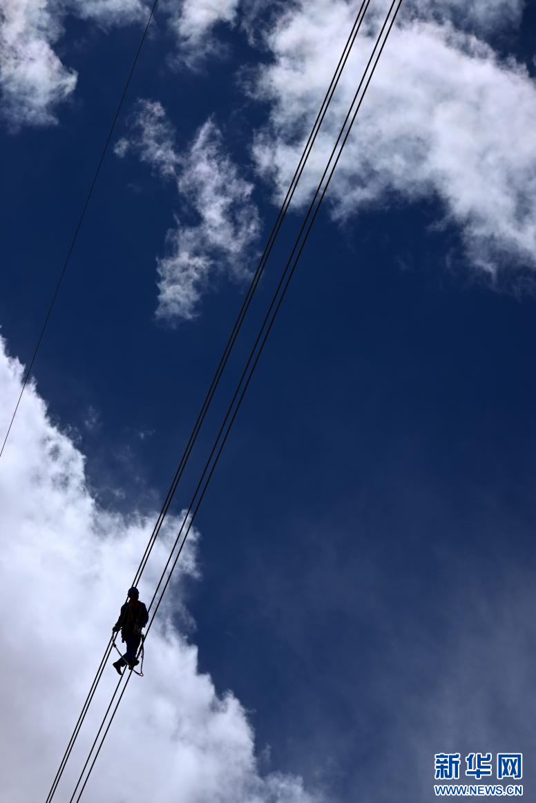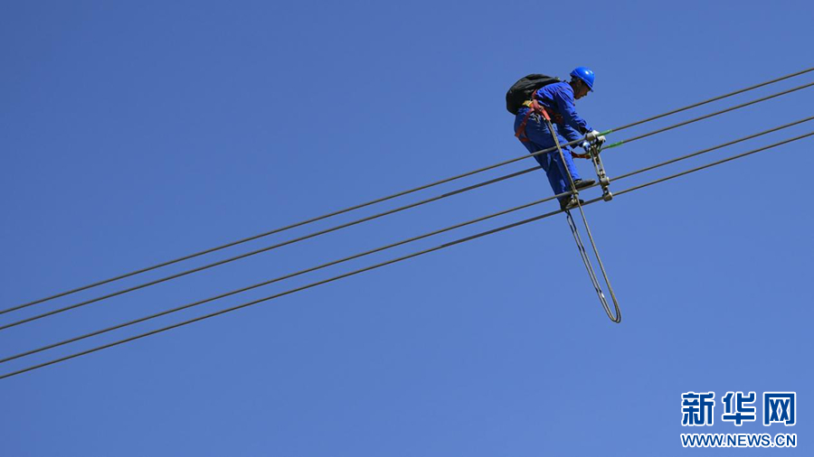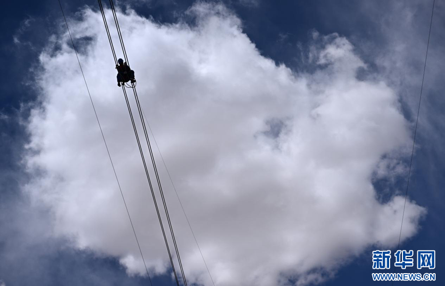 在平均海拔超過4500米的長(zhǎng)江源頭腹地,檢修人員克服高寒缺氧的環(huán)境,在云端走線巡檢,成為“電力天路”一道獨(dú)特的風(fēng)景。新華社記者 張宏祥 攝