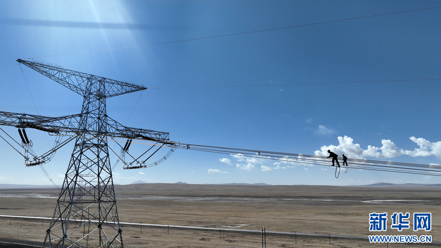 在青海省海西州格爾木市唐古拉山鎮(zhèn)境內(nèi),檢修人員在走線巡檢中(6月3日攝)。新華網(wǎng) 潘彬彬 攝
