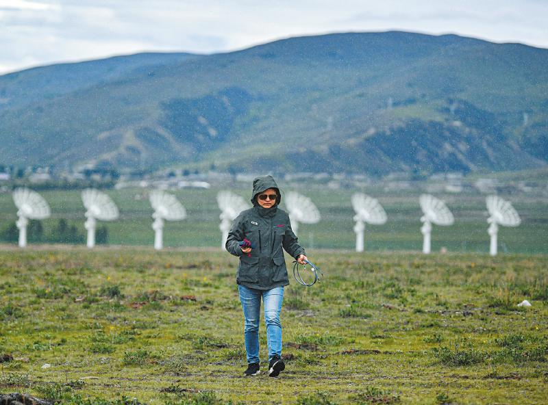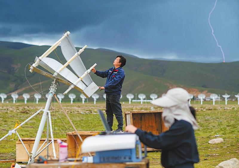 7月8日,四川省甘孜州稻城縣噶通鎮(zhèn)天氣說變就變。在國家重大科技基礎(chǔ)設(shè)施——空間環(huán)境地基綜合監(jiān)測網(wǎng)(子午工程二期)圓環(huán)陣太陽射電成像望遠(yuǎn)鏡項(xiàng)目建設(shè)現(xiàn)場,中國電科第39研究所現(xiàn)場施工負(fù)責(zé)人葉愛林和同事正在進(jìn)行天線增益調(diào)試實(shí)驗(yàn)。突然,一道閃電劃過天際,轟隆隆的雷聲過后便是傾盆大雨,葉愛林和同事不得不停下手中正在進(jìn)行的實(shí)驗(yàn),臨時(shí)找地方躲雨?!斑@雨下不了多久,等雨停了,我們再繼續(xù)?!痹陧?xiàng)目建設(shè)現(xiàn)場已工作了480多天的他,被同事們稱作半個(gè)氣象“土專家”。他不僅能“察言觀色”看懂高原上的云彩,還能大差不差地推測出天氣變化。在海拔3800多米的噶通鎮(zhèn),許多科研人員像葉愛林一樣,默默奮戰(zhàn),希望在建的這一國家重大科技基礎(chǔ)設(shè)施能早日運(yùn)行,為中國空間科學(xué)事業(yè)的發(fā)展提供關(guān)鍵性的探索幫助及技術(shù)支持,使我國步入世界空間科學(xué)領(lǐng)域的先進(jìn)行列。
