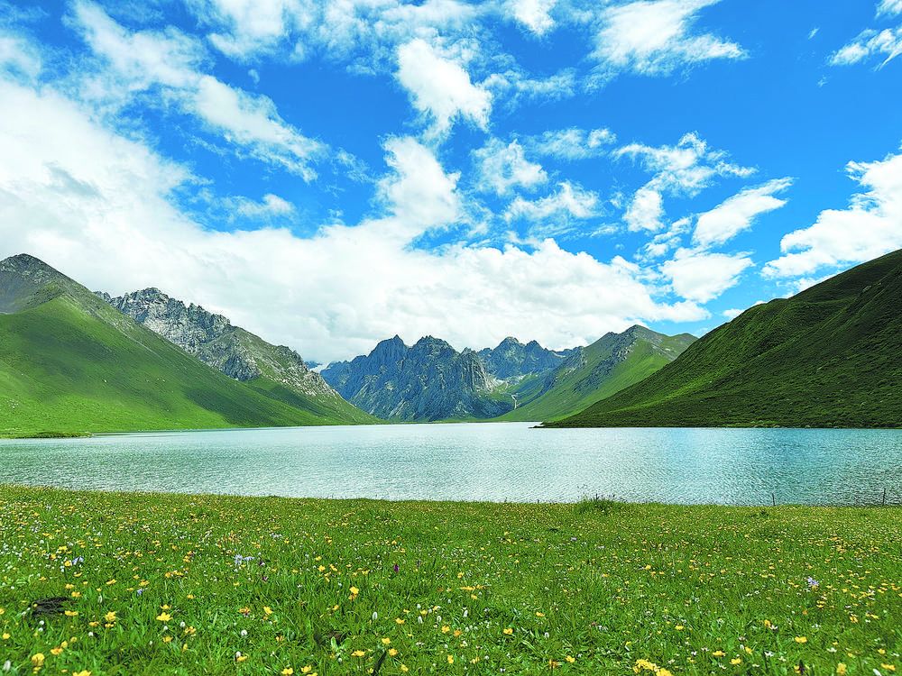 七月,本就是草原最美的季節(jié)。地處“三江之源”的果洛,此時(shí)也展現(xiàn)出它一年中最俊逸美好的樣子:潔白云朵和湛藍(lán)天空之下,大片大片綠地毯般的草原上,牦牛信步、俊鳥飛翔……車輪滾滾向前,我們離當(dāng)?shù)夭刈迦罕姺Q為“神山神水神話”的世界越來越近了,神秘浪漫的“年保玉則”近在眼前。