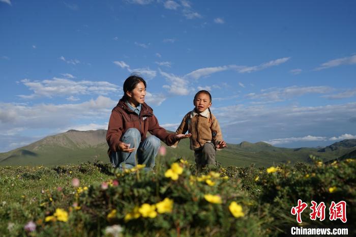 圖為麻切仁措與弟弟在草原上唱歌玩耍。馬銘言攝