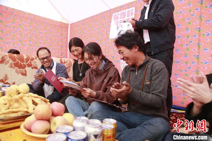 圖為果洛州民族高級中學校長李鵬(左一)與麻切仁措一家分享收到錄取通知書的喜悅。馬銘言攝