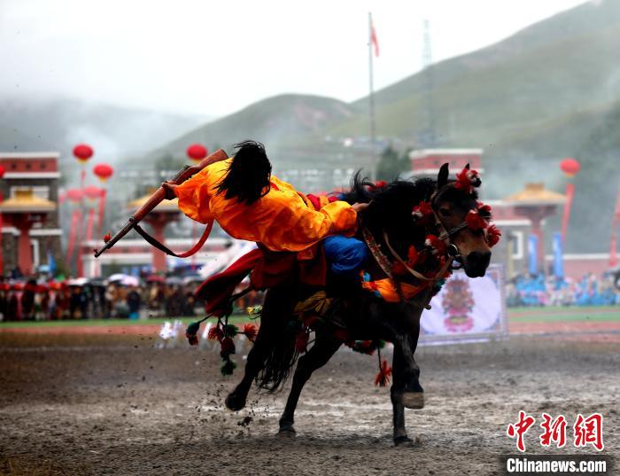 圖為玉樹傳統(tǒng)賽馬會現(xiàn)場的馬術(shù)表演。薛蒂 攝