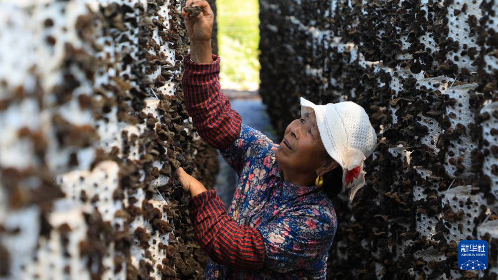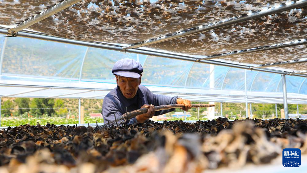 7月29日,在卓尼縣納浪鎮(zhèn)納浪村黑木耳種植基地,農戶在翻曬黑木耳。新華社記者 張智敏 攝