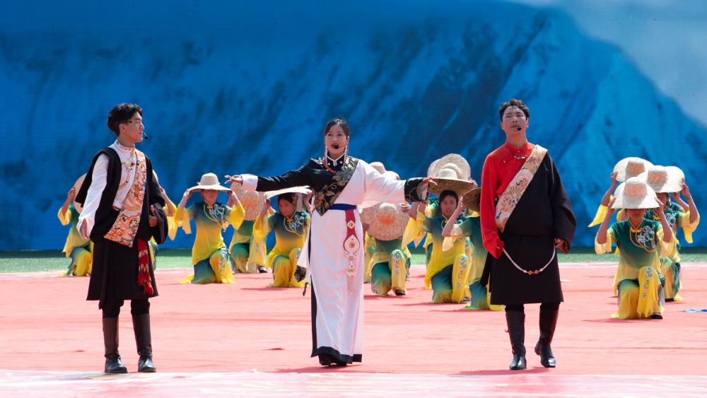 8月1日,當(dāng)?shù)厝罕娫诤D喜刈遄灾沃莩闪?0周年慶祝大會(huì)上表演節(jié)目。新華社 潘彬彬 攝