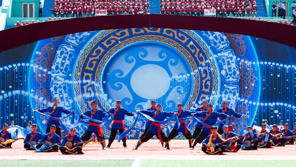 8月1日,當(dāng)?shù)厝罕娫诤D喜刈遄灾沃莩闪?0周年慶祝大會(huì)上表演。新華社記者 解統(tǒng)強(qiáng) 攝